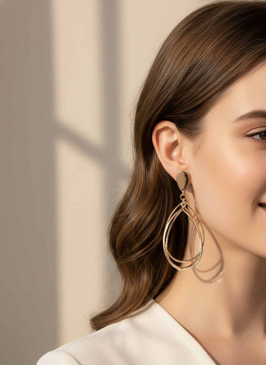 The 3-Layer Gold Petal Earring, each earring is made of three thin, teardrop-shaped loops that are layered together to create a rich, 3D effect.