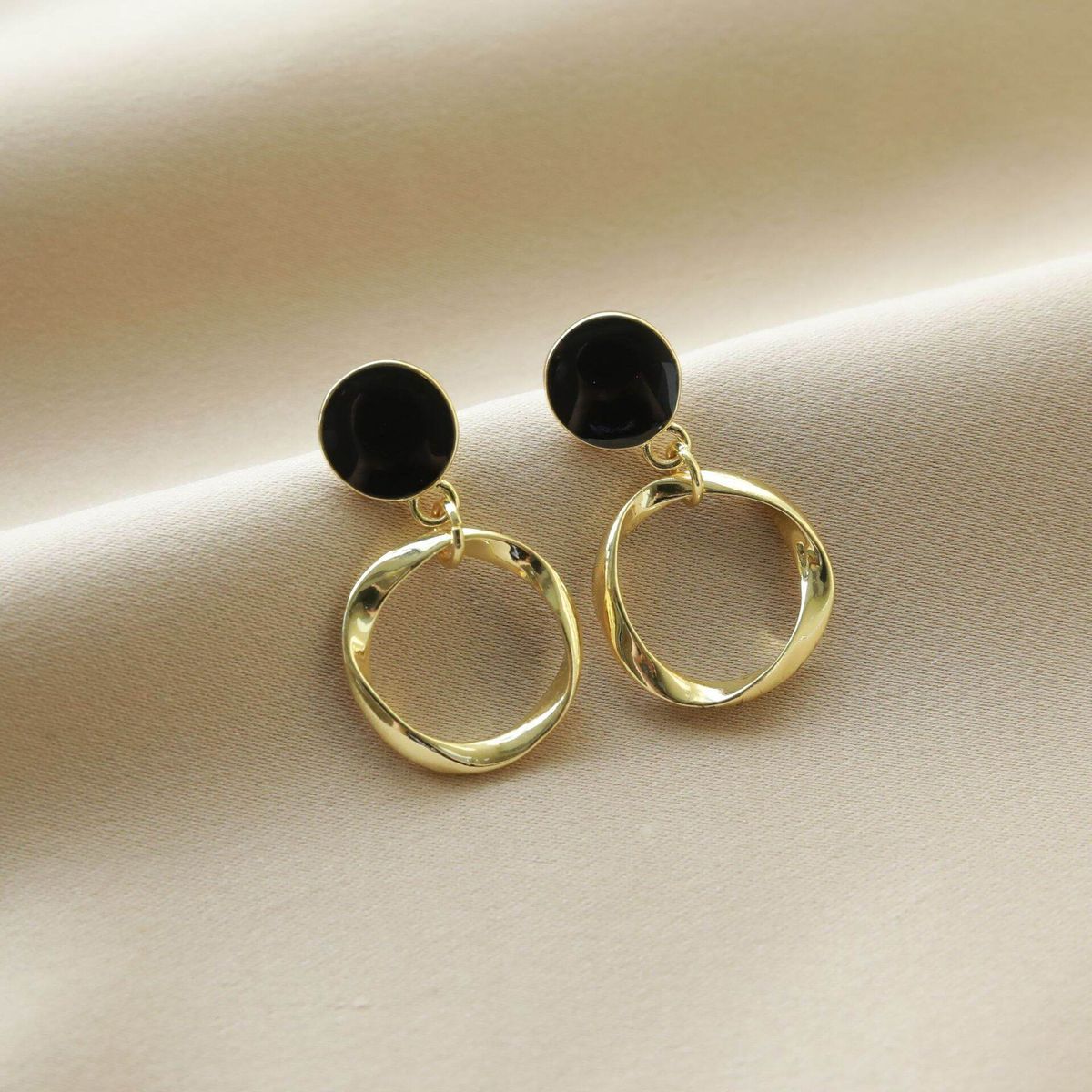 Design: Round Glossy Black Stud with a Hanging Wavy Gold Hoop.