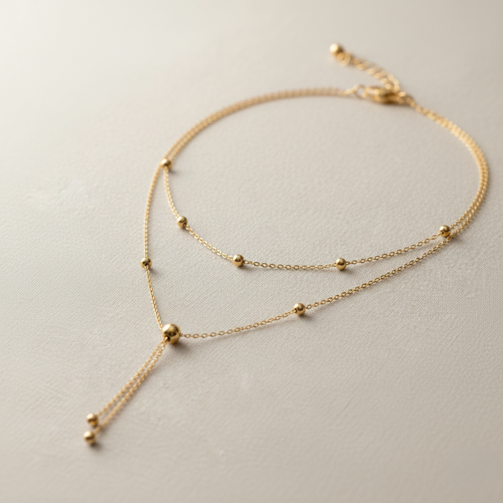 Our Layered Gold finish Bead Lariat Necklace is designed for the modern woman who loves the “minimalist aesthetic.” The top layer sits delicately against the collarbone with evenly spaced gold beads, while the bottom layer features a stunning lariat-style drop that elongates the neckline.