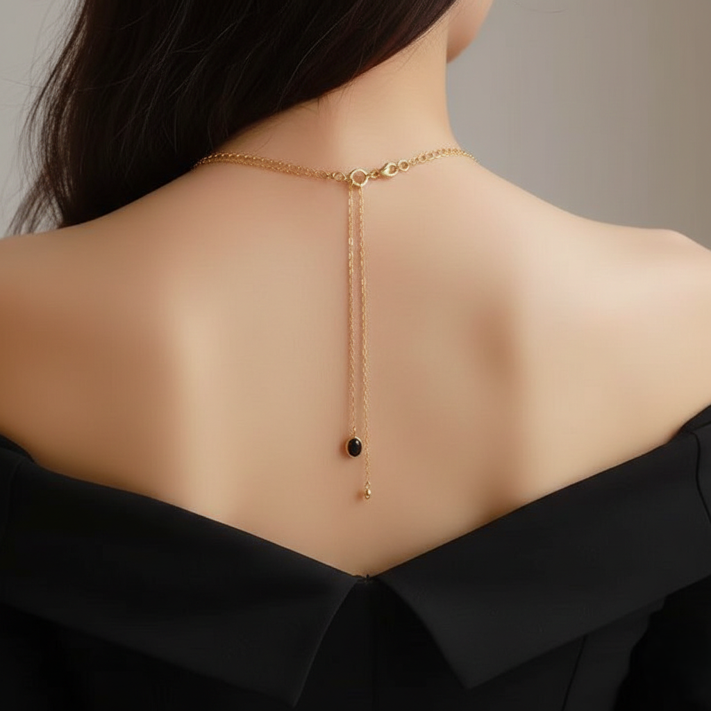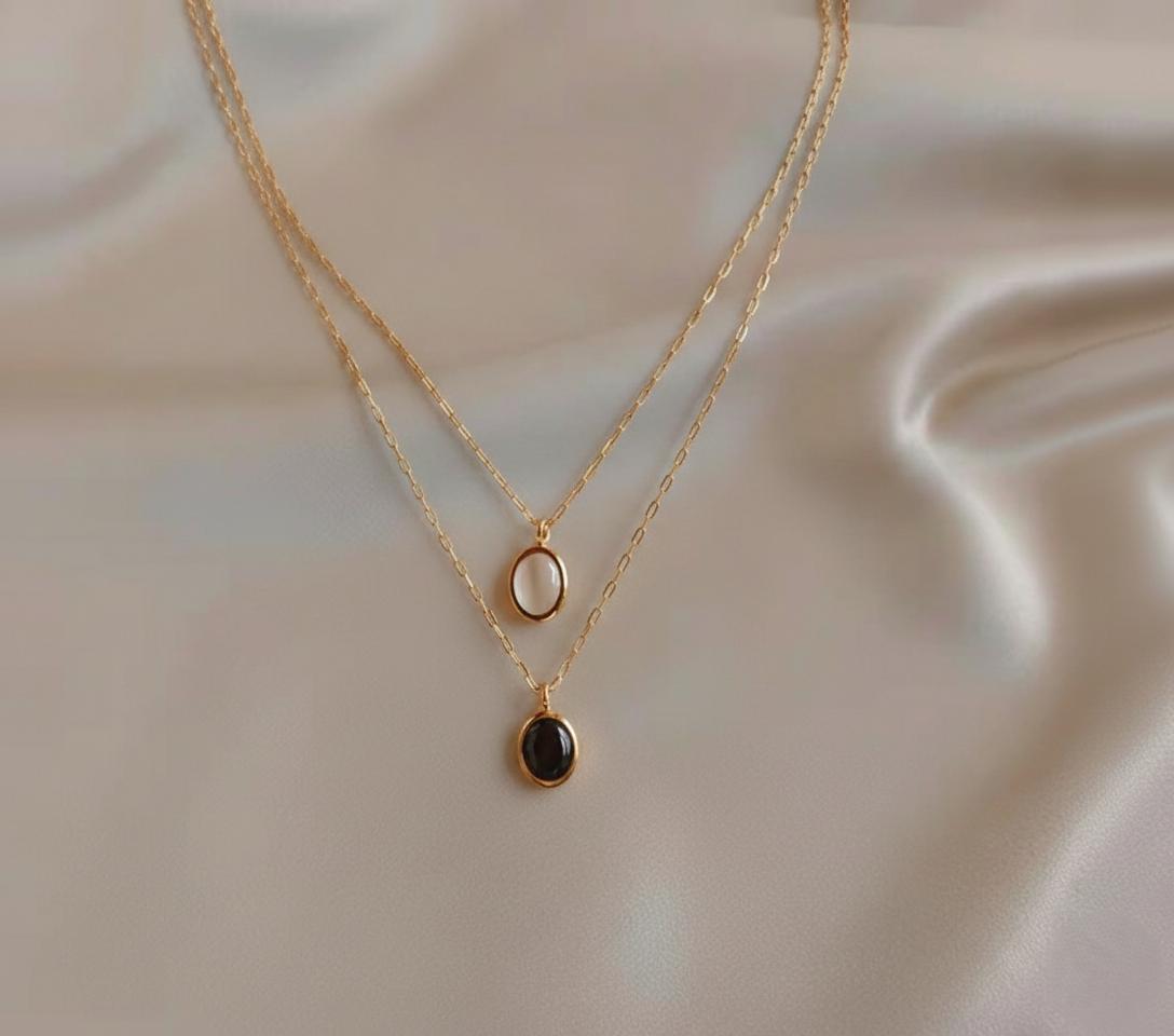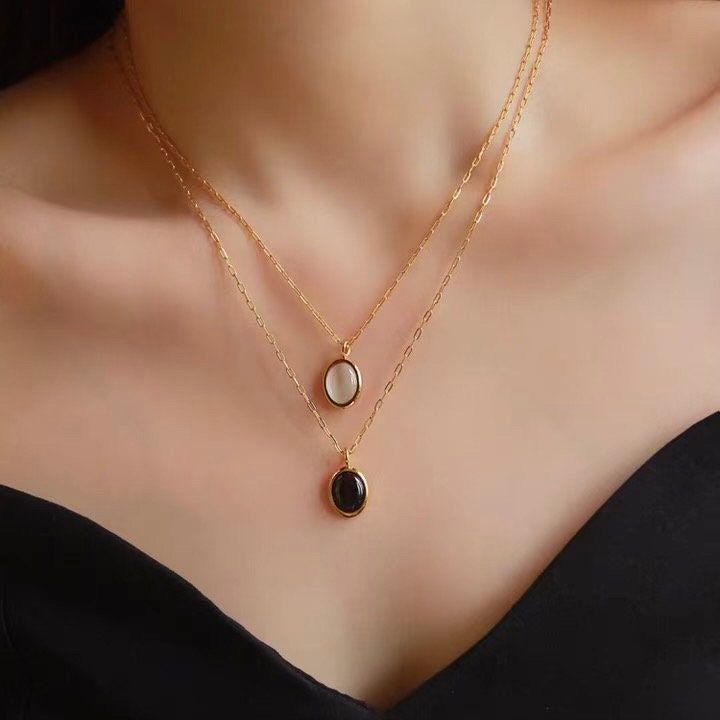 The shorter tier features a radiant white oval stone that brightens your neckline, while the longer tier holds a sophisticated black oval stone for a touch of drama. Both stones are encased in a smooth, high-shine gold frame, making this piece versatile enough for a day at the office or a special evening out.